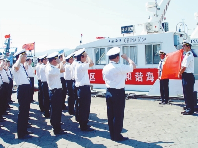 图为北仑海事处在7月1日开展“海事执法党员活动日”时,党员执法人员面向党旗宣誓。(崔志金 摄)