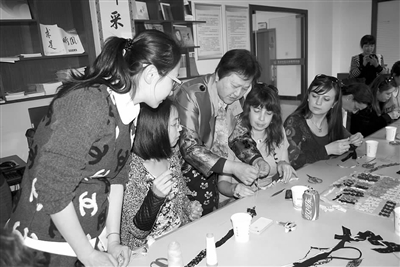盘扣或称盘纽,是传统中国服装使用的一种纽扣。盘扣的花式非常丰富,图形多样,作为一种传统的衣饰广受欢迎。课上,培训老师贺志维将自己亲手做的多种盘扣拿了出来,马上吸引了大家的目光。一排排盘扣色彩各异,花式各样,散发着传统气息。盘扣开始编织前需将布条用暗针缝成长长的细条,之后再学做纽头。不久后,几位外国友人慢慢掌握了纽头的做法。经过摸索,大家手中的纽头变得越来越好看,渐渐显示出了盘扣的雏形。