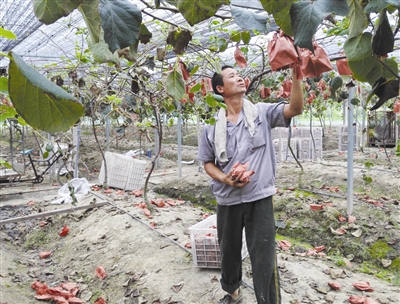 去年园区的猕猴桃并没有套袋子,今年汪贵章考虑到果面的美观,给每一个猕猴桃都穿了一件“防护衣”。