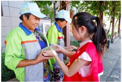 昨日,柴桥街道瑞岩社区的小朋友将绿豆汤送到环卫工人手中,感谢他们在平凡的岗位上辛勤劳作。 本刊记者 陈志明 通讯员 张洁琼 摄