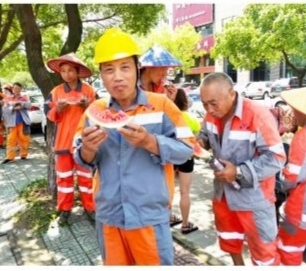 7月22日,玉兰社区包子哥服务队的爱心人士带着700多斤收购自安徽困难瓜农的西瓜,来到城区三处环卫工人休息点,为高温下坚守岗位的环卫工人送来清凉。 本刊记者 廖俊利 通讯员 金添盛 陈 红 摄