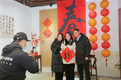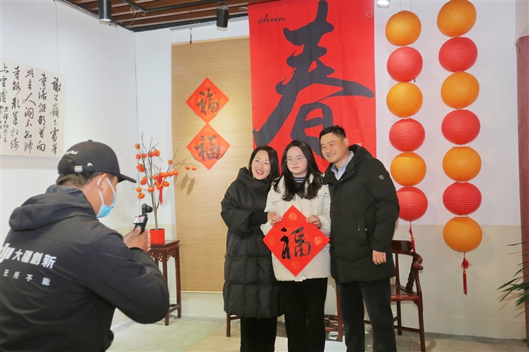 本刊讯(通讯员 何凤云)小雨淅沥,挡不住大家对过年的热情。在大碶街道文化宫,红灯笼、红福字、火红的“柿柿如意”盆栽及巨幅“春”字组成的布景前,来自大碶街道玉山工业社区的吴海彬一家三口,正在摄影师的镜头前定格属于他们的新春全家福。一旁书法协会老师们的摊位前也排起了小长队。