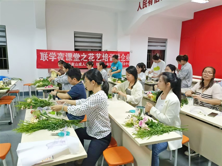 本刊讯(通讯员 曹琭 余灵超)“离开校园这么久了,还有机会和女儿一起上‘晚自习’,这种感觉真奇妙。”近日,在“联学夜课堂”的花艺培训课上,除了学员王女士带着12岁的女儿一同来上课之外,还有不少上班族带着父母也出现在课堂中。