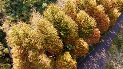 近日,北仑大海线两侧,不同品种的水杉交织叠加,颜色深浅不一,形成一幅五彩斑斓的美丽画卷。 仑传拍客 王 谨 摄