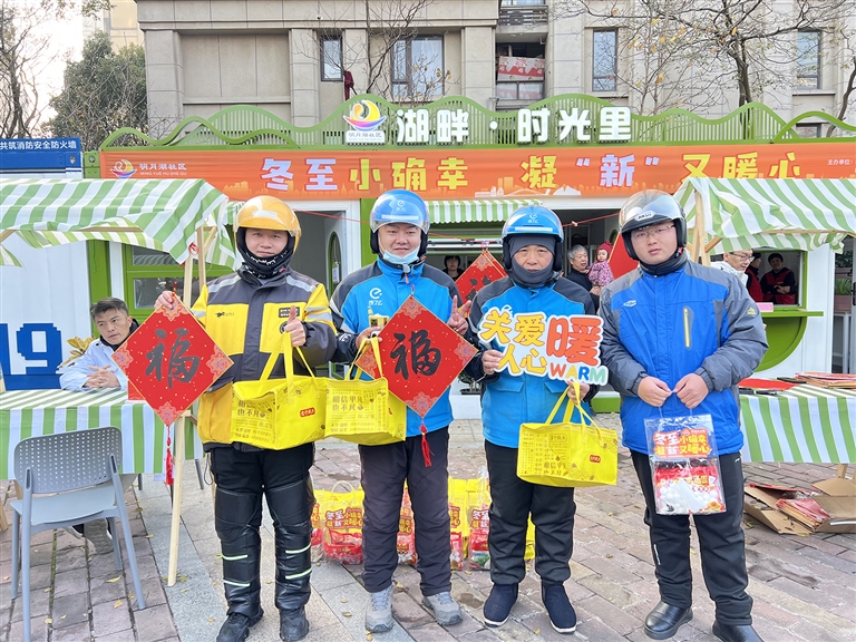 同时,现场还有明月湖社区星悦荟商圈联合工会设置的“饺子”摊位,在冬至来临之际,为外卖小哥送上热气腾腾的饺子,不仅驱散了冬日的寒意,更温暖了在场每个人的心田。