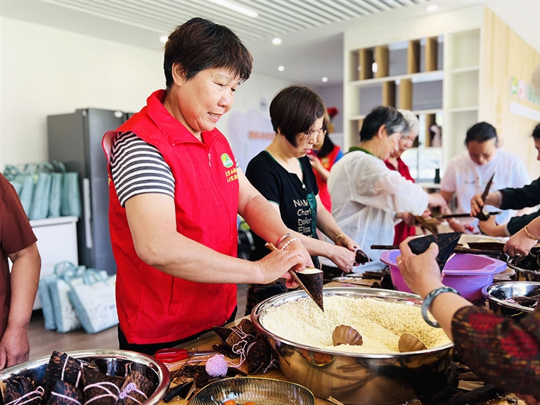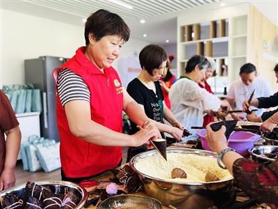 “这样把两片粽叶叠好,米就不会漏出来。”头发花白的王阿姨一边包着粽子,一边和身旁的志愿者交流制作心得。她手法娴熟,动作利落,转眼间包好了一排粽子。