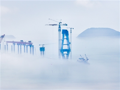 近日,梅山沿海被轻柔的平流雾笼罩。建设中的宁波舟山港六横公路大桥二期青龙门大桥在雾海中若隐若现,宛如一幅梦幻般的水墨画卷。 本刊记者 郝玉亮 严健中 摄影报道