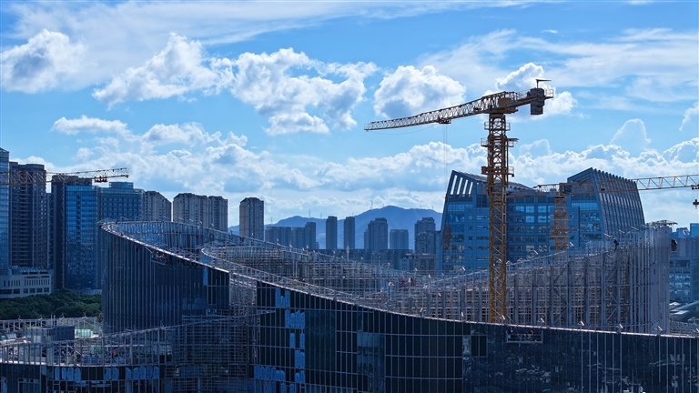 在城市的脉动中,工地是生长的印记,是未来的篇章。钢筋铁骨拔地而起,机械轰鸣奏响发展的乐章,而头顶的蓝天与流云,则为这片繁忙的风景增添了诗意。图为建设中的北仑区文化中心。