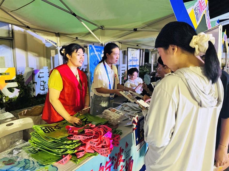 “赛事精彩,文明添彩。”“不做观赛显眼包。”……下午5点多,距离比赛开始不到2个小时,观众们陆续来到北仑体艺中心,等候排队进场。在广场互动区域,区新时代文明实践中心设置的文明观赛礼品兑换摊位格外醒目,观众们纷纷驻足合影打卡,转发文明观赛倡议书,参与互动小游戏,领取定制文明礼品。